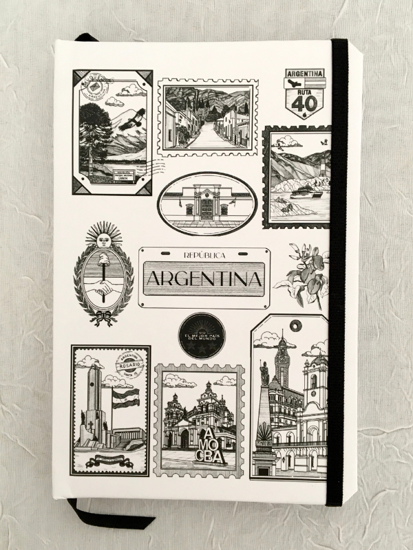 Cuaderno cosido con lomo de 12cm x 18cm con puntas redondeadas tipo Moleskine. Tapa dura forrada y laminada con cinta señaladora y elástico de cierre.